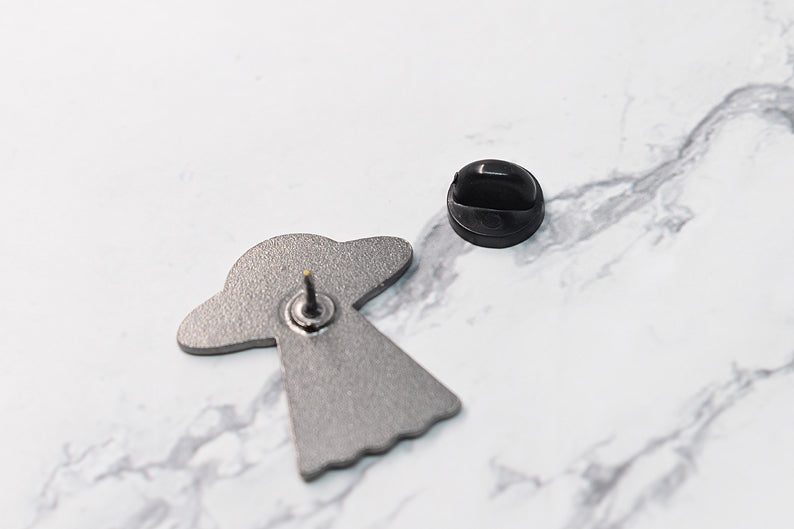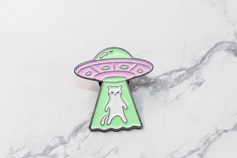 Pin's en émail représentant un chat kidnappé par un OVNI. Ce design fantaisiste et peu commun évoque l'intrigue et l'aventure intergalactique. Un choix amusant et unique pour les amateurs de science-fiction et de chats.