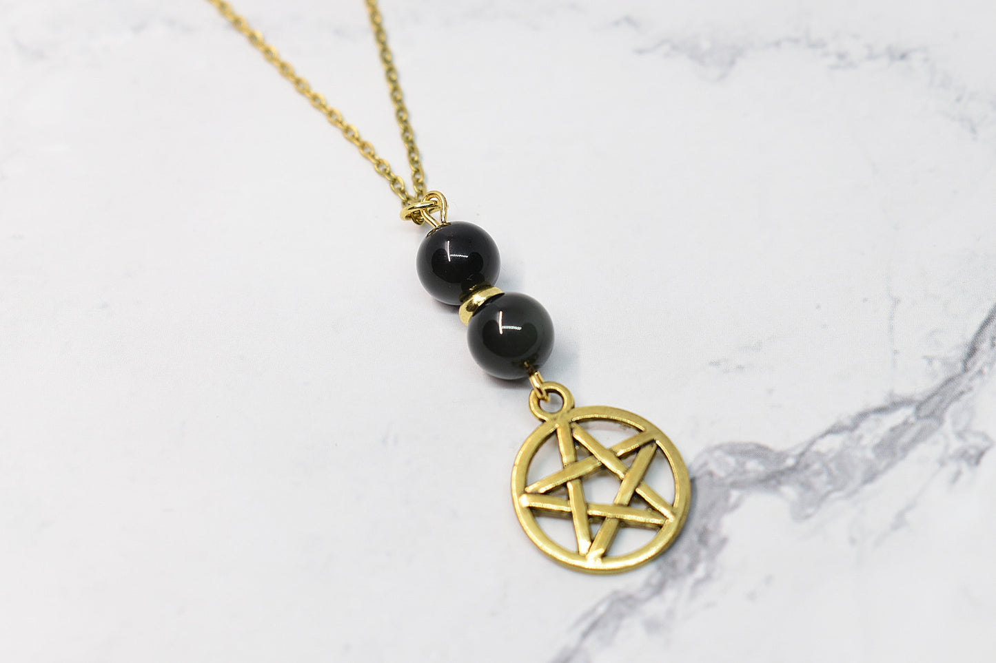 Pendentif pentacle en or avec pierre obsidienne oeil céleste