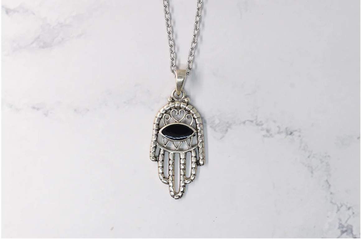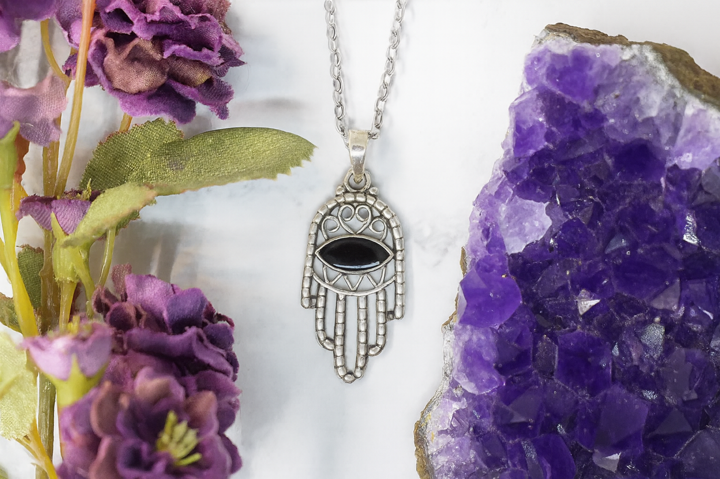 Pendentif Main de Fatima en argent sterling 925 avec pierre d'onyx