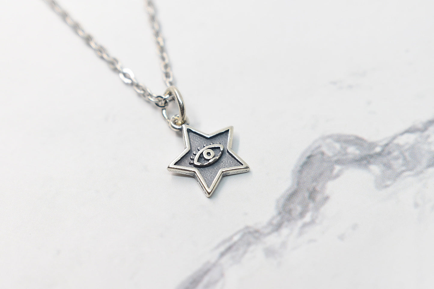 Plongez dans le monde de l'éclat subtil avec notre petit pendentif étoile en argent sterling. Niché dans cette étoile délicate se cache un œil mystérieux, symbole de protection et de clairvoyance. La chaîne en acier inoxydable complète cette pièce élégante, parfaite pour exprimer votre style unique et attirer les regards admiratifs.