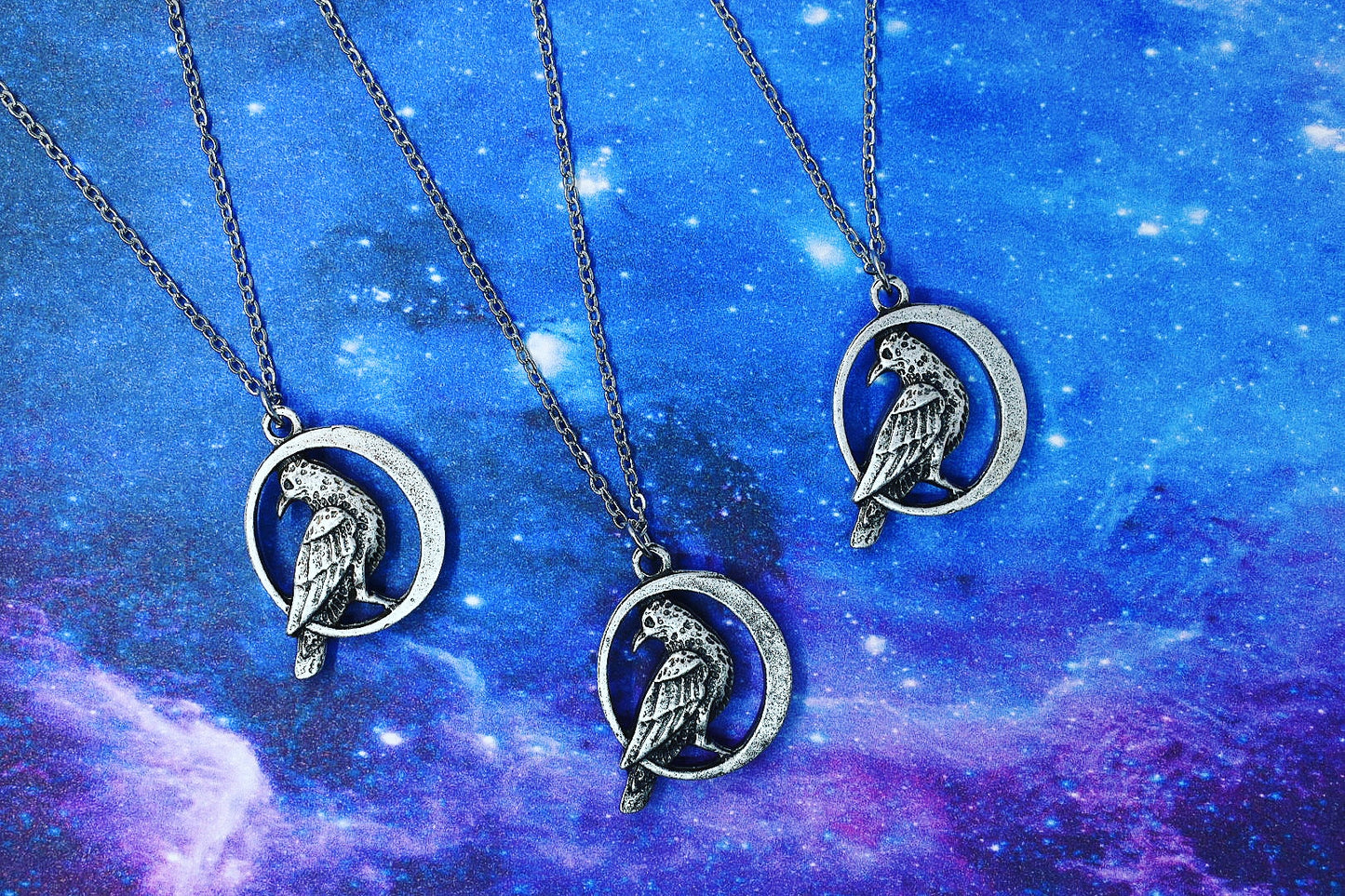 Pendentif corbeau en zinc niché dans un croissant de lune, suspendu à une chaîne en acier inoxydable. Un élégant emblème de mystère et de sagesse, parfait pour les amoureux de la nature.