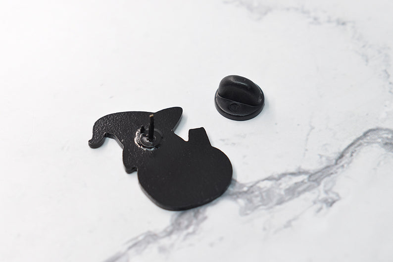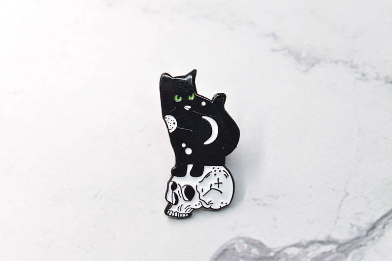 Unveil your mysterious side with this enamel pin, showcasing a black cat perched on a skull. Embodying intrigue and the unknown, this darkly beautiful accessory is perfect for those who appreciate the mystical. Make a bold statement with this unique piece..