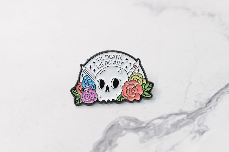 Enamel pin depicting a skeleton holding a flower. A delicate fusion of life and death, this brooch evokes the ephemeral beauty and cyclical nature of existence.