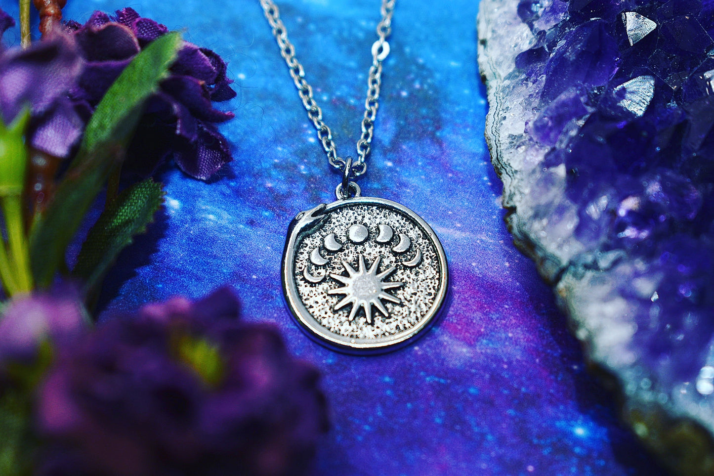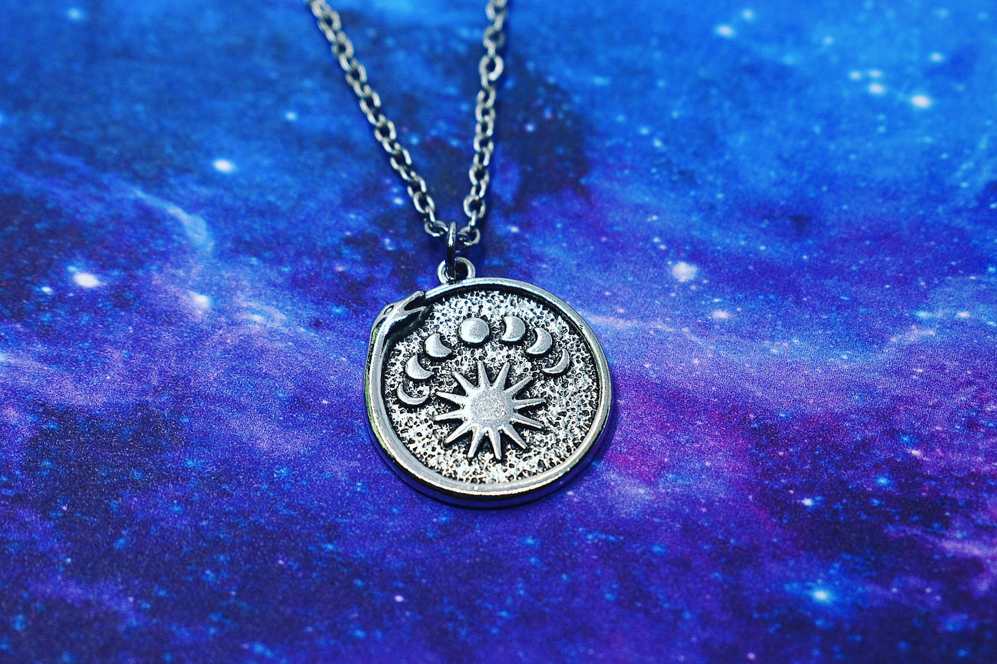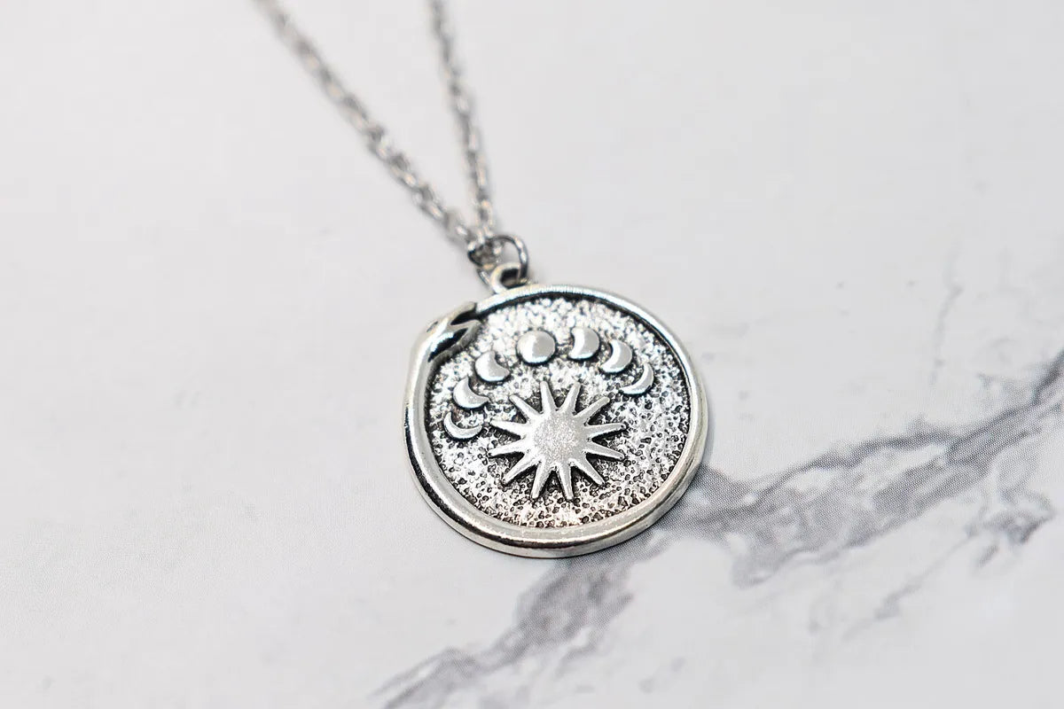 snake ouroboros necklace, moon phase, sun, witch jewelry, wicca jewelry