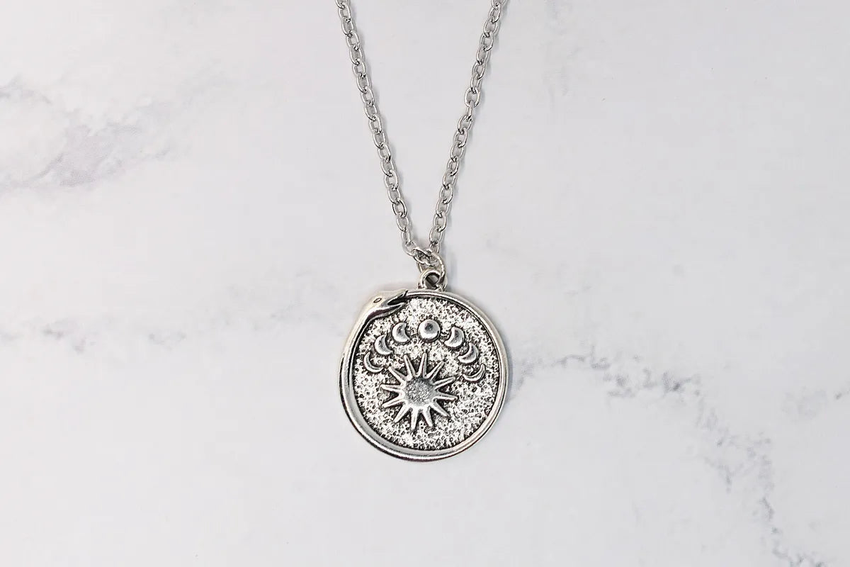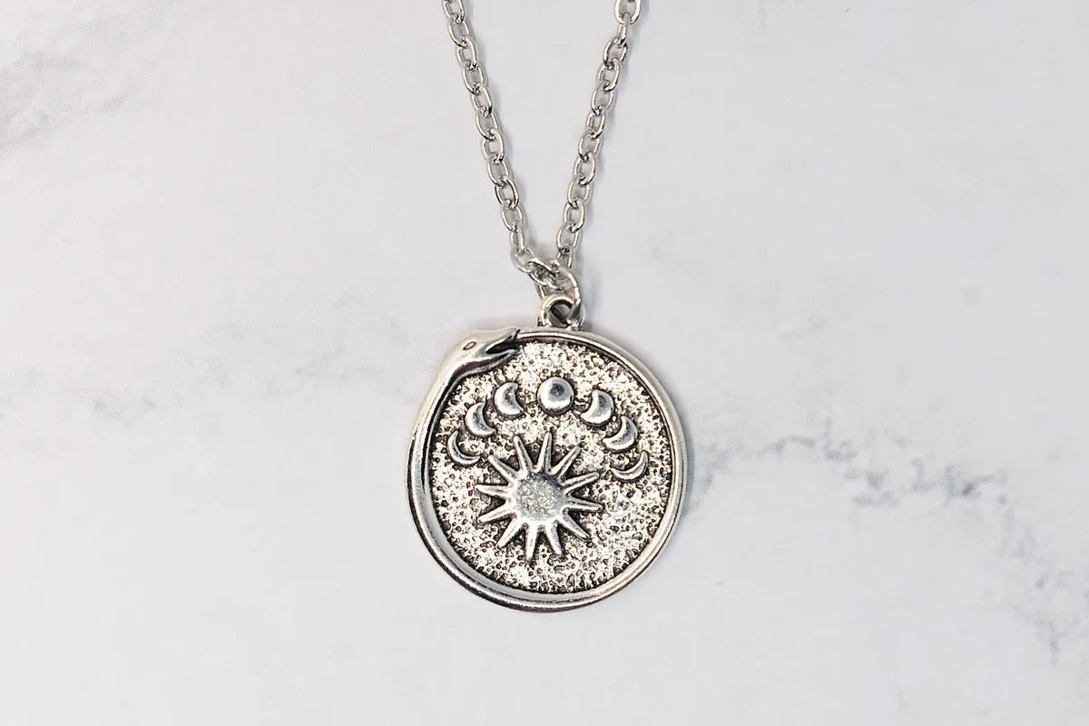 Discover our stainless steel necklace, adorned with a captivating zinc pendant of an Ouroboros serpent, sun, and moon phases. This piece captures the mystical cycle of life, death, and rebirth symbolized by the Ouroboros, complemented by the celestial elements. With its durability, it serves as a constant reminder of the eternal ebb and flow of the universe. Wear this necklace to reflect your appreciation for symbolism, the cosmos, and the cyclical nature of life. A perfect gift for seekers of wisdom and lovers of unique, meaningful style.