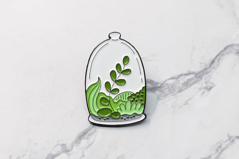 Enamel pin depicting a terrarium with a plant inside. Symbolizing growth and encapsulated nature, this elegant brooch brings a touch of greenery and tranquility to your outfit. Ideal for gardening enthusiasts and nature lovers.